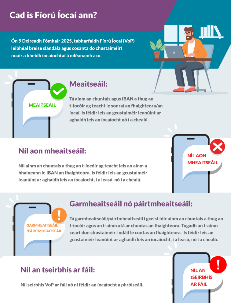 Leis an Rialachán maidir le hÍocaíochtaí Meandracha, déantar leibhéal breise slándála agus cosanta, ar a dtugtar Fíorú Íocaí (VoP), a thabhairt isteach do chustaiméirí nuair a bheidh íocaíochtaí á ndéanamh acu, le héifeacht ón 9 Deireadh Fómhair 2025.