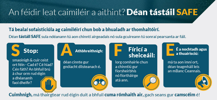 - Bí amhrasach faoi aon téacsanna a fhaigheann tú gan choinne a mhaíonn gur ó eagraíocht iontaofa iad, amhail do bhanc nó d’eisitheoir cárta creidmheasa/dochair, An Post nó na Coimisinéirí Ioncaim.